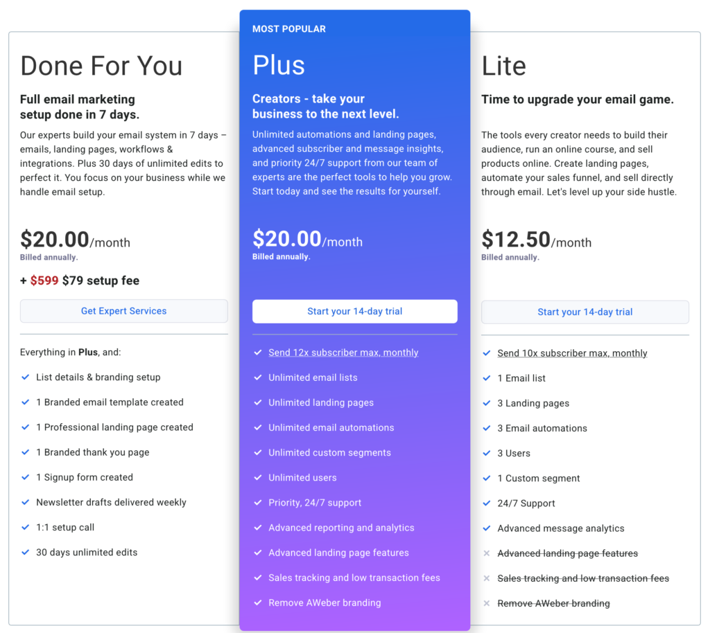 Pricing and Plans: AWeber’s Lite plan starts at $12.50/month and is billed annually. The Plus plan starts at $20/month (also billed annually) and comes with additional features, as well as customer support priority.
