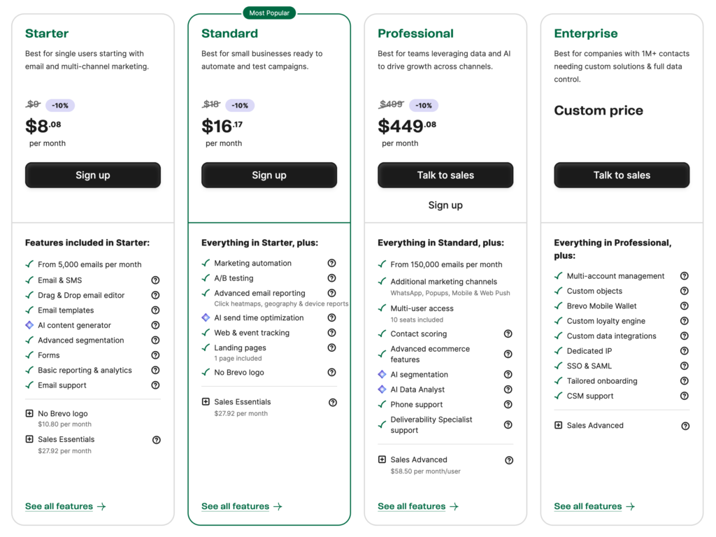 Pricing and Plans: Brevo has four plans: Free, Starter, Standard, Professional and Enterprise. The lowest-priced plan (not including the free plan) starts at $8.08/month for 5000 emails/month.
