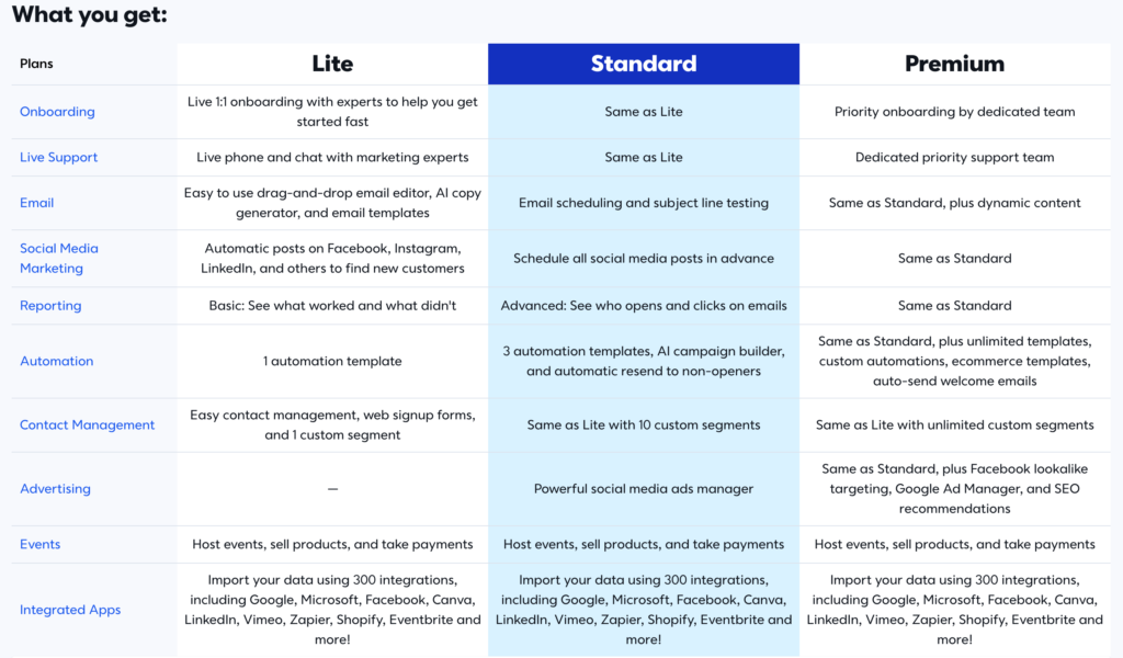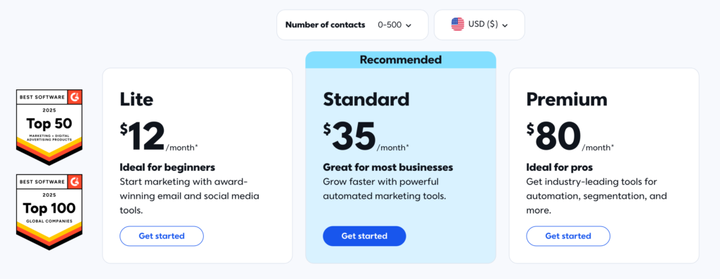 Pricing and Plans: The beginner-oriented Lite plan starts at $12/month for up to 500 contacts and increases from there based on the number of contacts. There’s also the Standard plan and Premium plan which starts at $35/month & and $80/month .