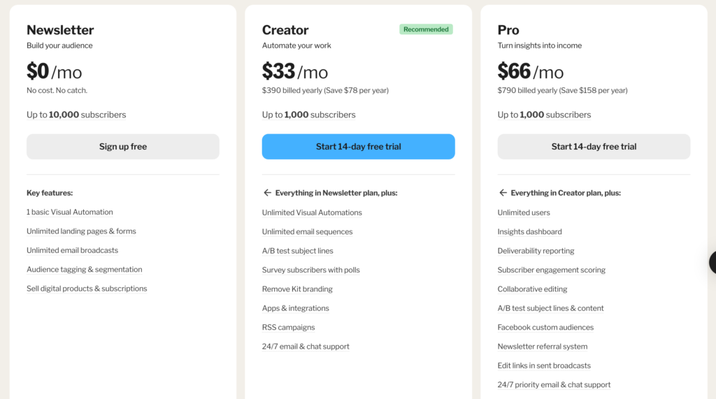 Pricing and plans: Apart from its free plan, Kit has two paid plans: Creator (starts at $33/month for Up to 1,000 subscribers) and Creator Pro ($66/month for Up to 1,00 subscribers). Both plans are billed annually, but you can change to a monthly payment plan for a higher cost.