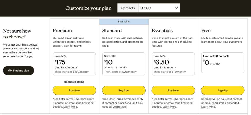 Pricing and Plans: Mailchimp pricing starts at $6.50/month for 500 contacts with its Essentials plan and rises to $175/month with its Premium plan. There’s also a free plan with access to basic email marketing features.