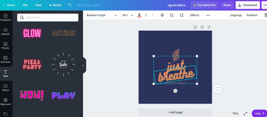 If your logo requires text, head over to the Text tab. In this tab, you’ll find various text compositions. Those are fun because they let you preview and play around with various font combinations and hierarchies. If you have a good idea of your text composition, simply add a heading to your artboard and get styling.