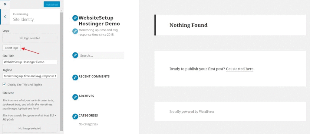 Each WordPress theme may have a few different settings here, and that’s okay. For now, we’re only interested in the Site Identity tab. Once you click into it, you’ll see a few different website settings, including your website’s logo and an area to upload or re-upload a new one.