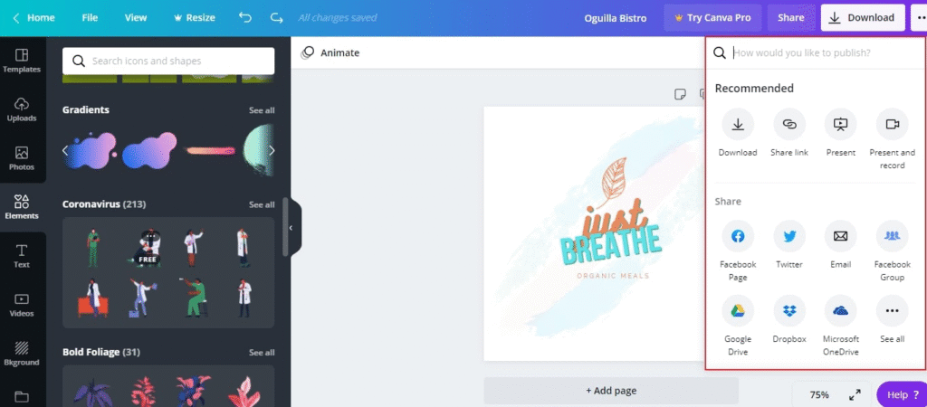 Otherwise, you can go ahead and jump into the Elements tab, which has a wide range of graphics and icons. Take your time to find the right ones for your design. You can change the colors, position, and opacity of your selected graphical elements as needed.