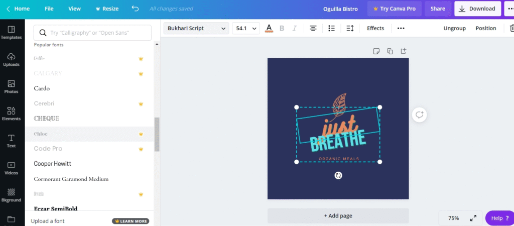 Each typography element in Canva has a few different customization features, such as color and text size. Most importantly, Canva has a large selection of fonts to choose from. But the app also allows you to upload your fonts (via a text link at the bottom of the font list scroll).