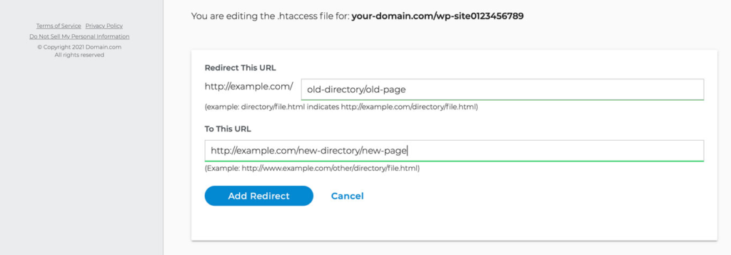 Then, scroll down to the Redirect Domain section and click the Add Redirect button. You can click it multiple times to add additional fields for each redirect you need.