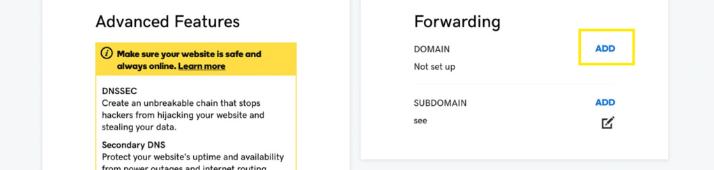 Then, scroll all the way down to the Forwarding section and click Add next to Domain.