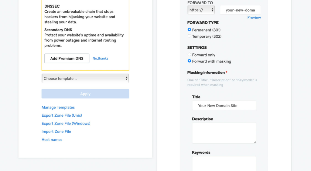 Forwarding your domain with masking means that after a user has visited your site with the new address, they’ll continue to see your new domain in the address bar of their browser as they go from page to page. It won’t just redirect to the old domain.