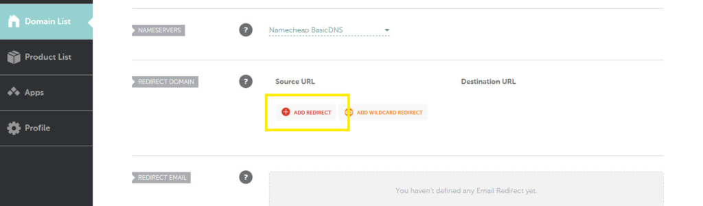 To add a 301 redirect to your Namecheap domain, log in and go to Domain List in the menu on the left.