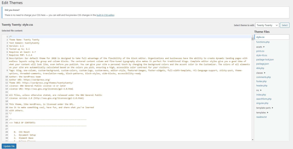There are multiple ways to start changing your theme code. One method involves navigating to the Admin dashboard > Appearance > Theme File Editor. That will display the array of files associated with each theme installed on your website, and you can customize your theme by modifying the code in these files.