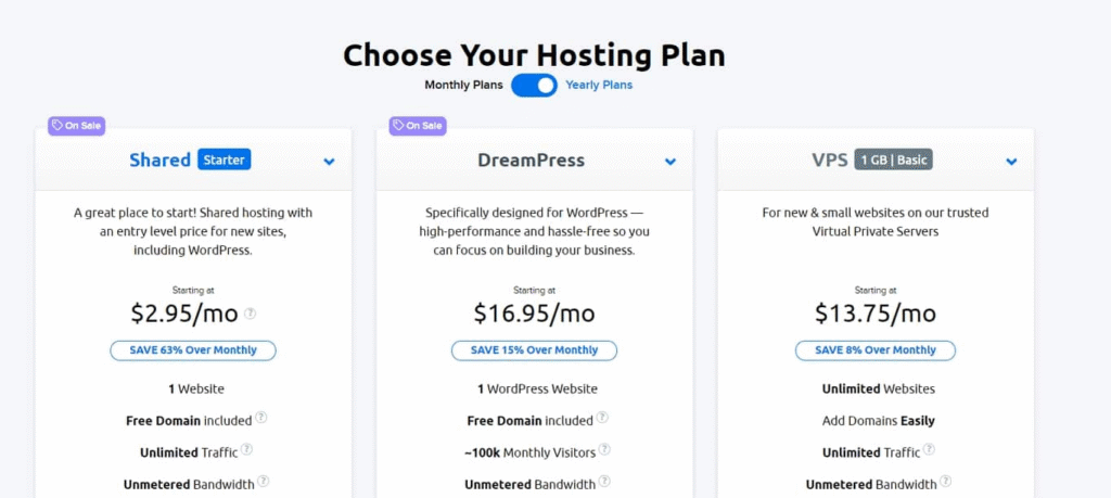 On the right-hand side, you can choose whether you would like to pay for your hosting monthly, yearly, or triennially.