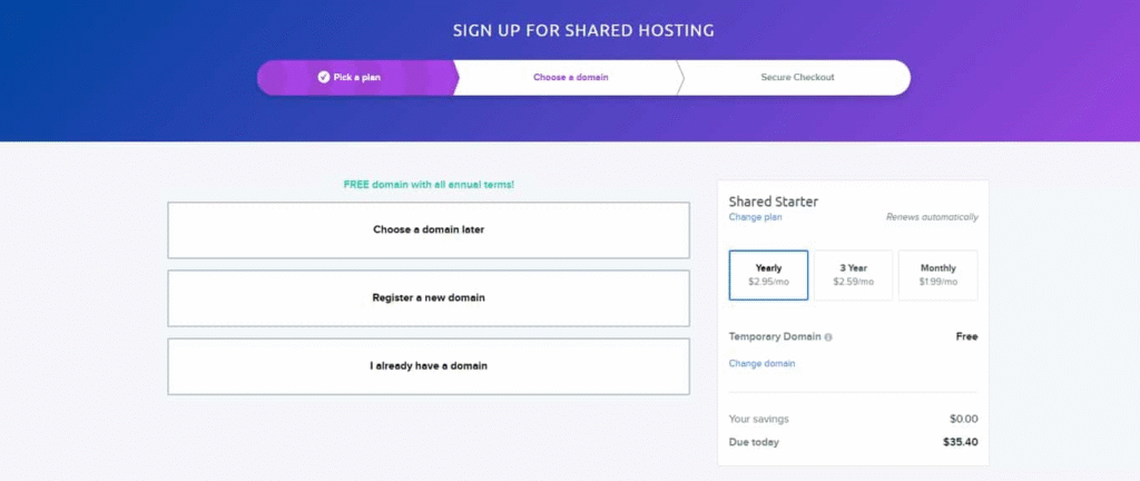 At this point, choose whether to register a new domain, you already have a domain you wish to use, or if you’re going to choose a domain later.