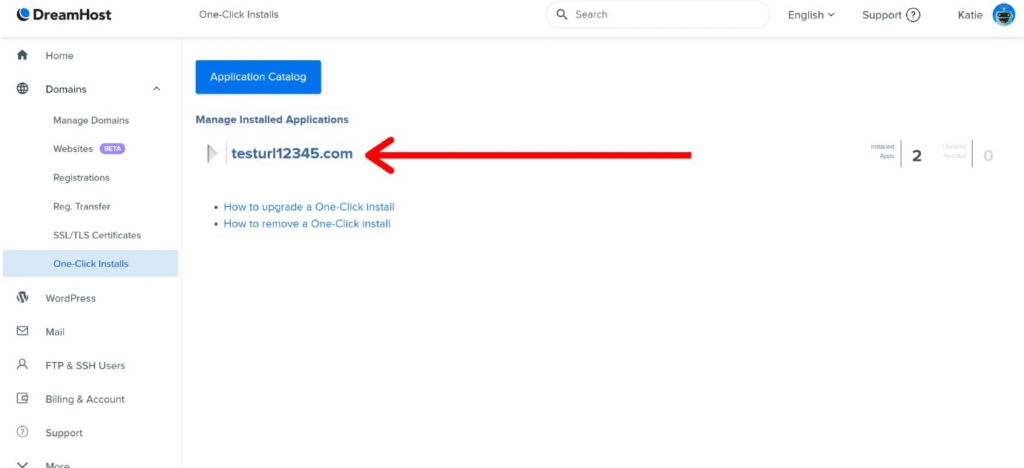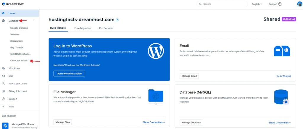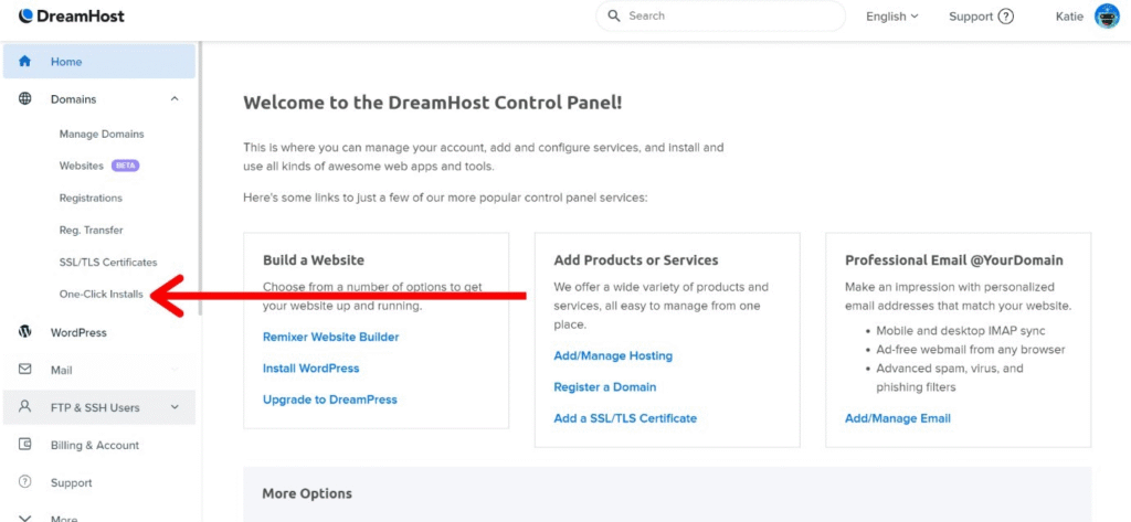 Once you’re on your DreamHost control panel, click on ‘Domains’ on the left-hand side menu to expand the options, and select ‘One-Click Installs’.