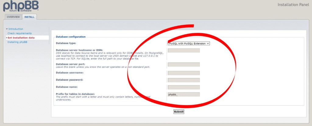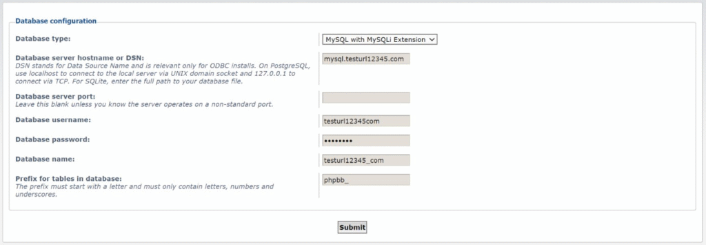 On this page, you need to scroll down until you find the database with the description that includes ‘phpBB’. Once you’ve found that, we can start copying and pasting the information across to the phpBB setup page.