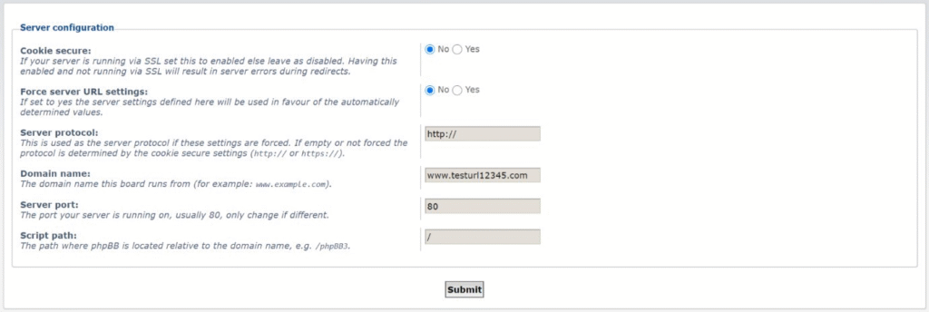 The setting you’ll most likely need is ‘No’ for ‘Force server URL settings’, but there are certain situations where ‘yes’ might be appropriate. If you want your forum showing on multiple domains, or you’re having trouble with redirects then ‘Yes’ might be needed. If you think that applies then you can read more about that here.