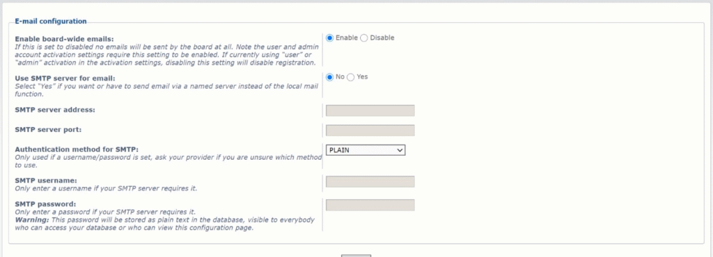 This part of the configuration is asking whether you want your forums to be able to send emails to members, for example, notifications when there’s a new post or a response to their post.